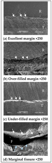 | Values (%) | Excellent Margin | Over-Filled Margin | Under-Filled Margin | Marginal Fissure | ||