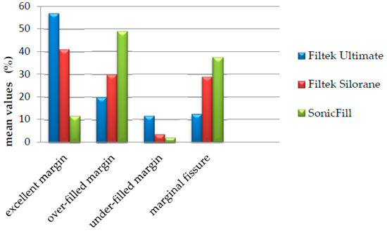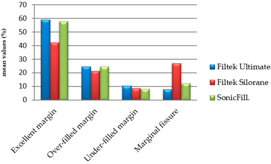 - F.Ultimate and F.Silorane differ statistically with more excellent results than SonicFill, for marginal adaptation to the gingival margin, located entirely in the dentin in class II cavities, after ten months of ageing in saline.
