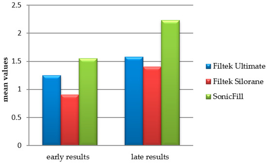 | 2 | Filtek Silorane | 10 | 44.37 ± 31.28 | 18.21 ± 18.04 | 10.25 ± 20.81 | 27.16 ± 39.63 |