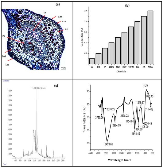 (a) Cross section of the leaf of Azadirachta indica. Magnification: 40×. col., collenchyma; ep., epidermis; x.v., xylem vessel; Ph., phloem; par., parenchyma; u.ep., upper epidermis; l.ep., lower epidermis; u. col., upper collenchymas; l. col., lower collenchymas; (b) chemical composition of ethanol crude neem extracts; EG represents Ethyl.alpha.-d-glucopyranoside, EO illustrates Ethyl 9, 12, 15-octadecatrienoate, P indicates Phytol. Similarly, 28DN represents 28-Deoxo-Nimbolide, 24DP represents 2,4-Dimethoxyphenol, 2Mv illustrates 2-Methoxy-4-vinylphenol and 1HPM, 4V5, HA and 14PA represent 1H-Pyrrole, 4-vinyl-syringol, Hexadecanoic acid, and 14-Pentadecenoic acid, respectively; (c) GC-MS analysis which identified different organic compounds from the ethanol crude extract of neem leaves; (d) FT-IR spectra of Neem leaves fine powder.