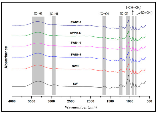 The surface functional properties of seaweed (SW), seaweed–neem (SWN), and seaweed–neem gamma irradiated films (SWN0.5–2.0) are shown in Figure 2. The predominant functional groups were the –OH, C–H, C–O, and C=O. The broad peak observed from 3100 to 3500 cm−1 was assigned to the presence of the O–H groups, which decreased as the neem was incorporated into the seaweed film. The peak also decreased as the irradiated dosage of the films was increased compared to the control film. The absorbance from 3000 to 2900 cm−1 and peaks from 1500 to 1700 cm−1 were attributed to C–H and C=O stretching vibration, respectively, which indicated no significant difference relative to the control film. Similar results have been reported in previous studies [16]. The peaks at 1639.49 cm−1 were due to the carboxyl group (C=O) which are attributed to the stretching of carboxyl groups in the sulfated polysaccharides of seaweed. A strong band appeared at 1000 to 1220 cm−1 for the raw seaweed, which increased as irradiation dosage of the films increased. The assigned peak was attributed to the sulfate ester-stretching of the seaweed backbone [36]. Increased irradiation of the films resulted in the breaking down of polymeric chains into mono, di, and oligosaccharides. This was attributed to the increase in C–O stretching vibrations as irradiation dosage increased. A noticeable relatively broad peak was achieved after the film was irradiated and increased as radiation dosage increased, indicating enhanced photochemical reaction in the film attributed to increased molecular mobility and the effect of interfacial interaction of neem extract in seaweed matrix [37]. The strong peaks at 990 to 1050.85 cm−1 could be attributed to the polysaccharide glycosidic linkage stretching vibration suggesting that irradiation of the films did not alter the interfacial interaction between the neem extract in the seaweed matrix [38]. The peaks present between 1033 cm−1 is assigned to C–O and C=CH2 stretching vibrations of pyranose rings. These functional groups are very commonly present in all polysaccharides. The peaks at 923.90 cm−1 were due to the presence of 3,6-anhydro-d-galactose, and peaks at 844.82 cm−1 were assigned to d-galactose-4-sulphate [39]. This particular functional group in seaweed enables the ability of seaweed to form a helical secondary structure, which is important for gel and film formation. The presence of a weak bands at 740 cm−1 is assigned to the skeleton bending of pyranose ring in seaweed [40].