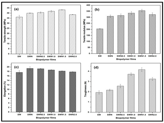 (a) Tensile strength and modulus (b) tensile modulus (c) elongation at break (d) toughness of seaweed, seaweed–neem, and seaweed–neem gamma irradiated film.
