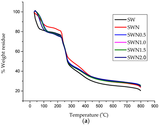 Thermal properties of the seaweed based films were studied using Thermogravimetric analysis (TGA) to investigate the decomposition and thermal stability of the films (Figure 5). It was revealed that the initial temperature of degradation (Ton), which is the point, the film began to disintegrate where deflection on the TGA curve was observed. The maximum temperature of degradation (Tmax) of the seaweed film was shifted to a higher temperature after the incorporation of neem leaves extract at 5 w/w % suggesting that the incorporation of neem leaves improved the thermal stability of the seaweed-based film [54]. This could be attributed to the strong intermolecular interactions of the film components as a result of higher energy required to break the intermolecular bonding, therefore leading to a higher Ton and Tmax. Moreover, the increase of thermal degradation temperature was also due to the presence of glycerol as a dispersing agent that could promote better seaweed–neem interactions [55]. The char residue content of irradiated seaweed–neem composite films was observed to increase after gamma irradiation. The gamma radiation caused chain scission or bond dissociations between seaweed and neem molecules due to the generation of free radicals. However, an increase in the percent residue confirmed the enhanced thermal stability of the irradiated seaweed–neem composite film [56] indicating the significance of irradiation of the films and the compatibility of the neem–seaweed intermolecular bonding interaction. The produced free radicals may react to change the structure of seaweed–neem film and strengthen the structure of the film. Hence, gamma radiation application could increase the thermal stability of the fabricated seaweed–neem composite film at 1.5 kGy. Gamma irradiation has the tendency to accumulate interfacial atoms and polymeric structural changes within the seaweed matrix [57]. The effect of irradiation possibly enhanced the thermal properties of the fabricated seaweed–neem composite films at the exposure of gamma radiation. Similarly, the seaweed–neem film exhibited higher percent residue compared to the control film, clearly indicating that the incorporation of the neem leaf extract in the seaweed matrix improved the thermal stability of the film. The (Ton) and the (Tmax) was shifted to a higher temperature after the gamma radiation treatment on the seaweed–neem composite film optimally at 1.5 kGy at 273.5 and 262 °C. Further increase in radiation treatment by 2.0 kGy resulted in a decrease in the degradation temperature and percent residue of the film by 251.21 °C and 30.2%, respectively. These findings were in good agreement with a previously reported study by [58], and it was revealed that the crosslinking of chitosan nanocomposite film with citric acid and magnesium oxide demonstrated an increase in thermal stability to up to 1.5 kGy of a gamma radiation dose. Generally, the TGA results of the irradiated seaweed–neem composite films indicated that the developed films exhibited higher thermal stability.