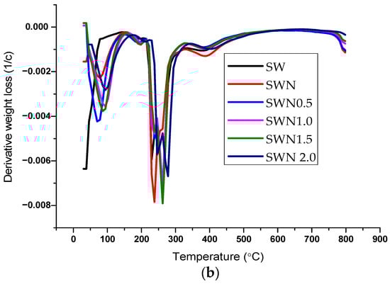 Thermal analysis indicating (a) TGA curve (b) DTG curve of the seaweed, seaweed-neem, and seaweed-neem irradiated films at different dosages.