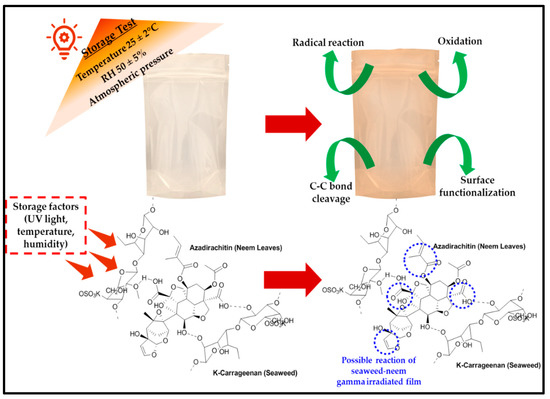 The application of biopolymer films has proven to be a suitable alternative to conventional plastics for active packaging. However, in this study, the possible mechanistic action of the irradiated antimicrobial films is illustrated in Figure 7. The capacity of the films to retain its hydrophobic properties until after nine months of storage revealed that an irradiated surface of the films provided active sites for better interactions with enhanced surface functional properties.
