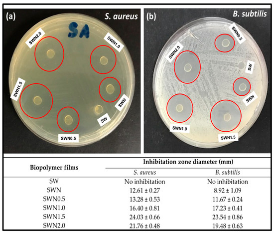 The antimicrobial activities of the films were measured using the agar diffusion method with film in a disc shape. The diameter of inhibitory zones surrounding the film discs was used to evaluate the inhibitory and antimicrobial activities of the irradiated films [67]. The antimicrobial activities of the seaweed-based films tested against Staphylococcus aureus, and Bacillus subtilis is indicated in Figure 8. As expected, the seaweed film (control) exhibited no inhibitory zones against the tested bacteria. However, the incorporation of 5% w/w neem leaves extract into the control film demonstrated inhibitory activities against Staphylococcus aureus and Bacillus subtilis with the diameter of inhibition zone of 12.61 ± 0.27 mm and 8.92 ± 1.09 mm, respectively [68], suggesting that the difference in the antimicrobial activities against bacteria was attributed to the lipid bilayer composition of bacterial strains and the degree of depolarization and permeability of the cell walls [69]. In addition, the antimicrobial activity of neem leaves extract-based seaweed films might be due to the presence of effective components such as carotenoids, phenolic compounds, flavonoids, triterpenoids, ketones, valavinoids, saponins, gilcosides, steroids, and tetra-triterpenoids azadirachtin in the neem leaves [21]. This could be attributed to the essential components of incorporated neem extracts in the seaweed matrix, which served as the principal antibiotics that could serve as a defensive mechanism against different pathogens [70].