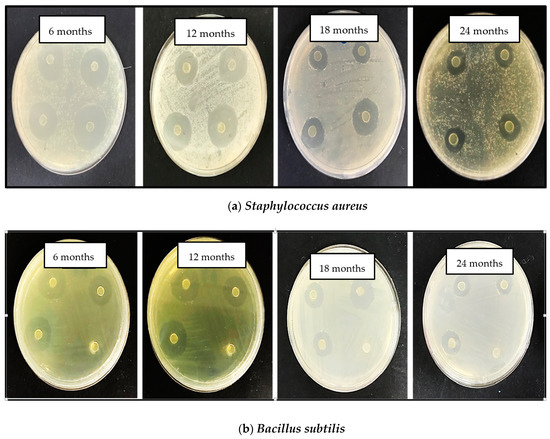 The stability of ISN film at storage conditions of 25 °C with 50% RH against Staphylococcus aureus (S. aureus) and Bacillus subtilis (B. subtilis) was investigated for 24 months using optimal irradiation dosage of 1.5 kGy as shown in Figure 9. Six months of storage were revealed, and the inhibition zone of ISN film was 13.15 mm against S. aureus and 22.05 mm against B. subtilis. The extent of inhibition of microbial activities slightly decreased after 24 months of storage compared to the effect of microbial activities before storage. The values of the inhibition zone achieved for S. aureus and B. subtilis were 10.03 mm and 18.78 mm, respectively. It was clearly evident that a slight decrease in the inhibition zone at 24 months of storage compared to six months of storage indicated that the ISN film exhibited stability against microbial activities during storage despite the prolonged storage period, suggesting that the antimicrobial effect of the film could be attributed to the relatively high concentration of ethyl. Alpha-d-glucopyranoside, ethyl 9, 12, 15-octadecatrienoate, and phytol compounds [66], which were the predominant compounds in the neem plant extract. The enhancement of the antimicrobial activity after a prolonged storage period could also be attributed to the significance of low constant storage temperature (25 °C), which optimally maintained the major active compounds of neem leaf extract such as nimbolide, phytol, and phenolic acid from evaporating. The authors in [73] reported that low storage temperature has a high tendency to maintain major effective compounds from evaporating in films compared to high storage temperature. The results of the effect of storage on antimicrobial activities of ISN films obtained in this study are in agreement with previous studies [74], which implies that, under the low constant temperature, ISN biodegradable packaging film exhibited effective antimicrobial activities against S. aureus and B. subtilis over a prolonged storage period as evidenced in enhanced antimicrobial activities even after a 24-month storage period.
