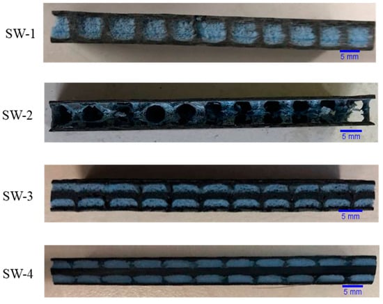 Four groups with different core architectures were prepared (shown in Table 1). The sandwich core could be divided into two parts: the TT resin cylinders parallel to the Z-direction and the core layers normal to the Z-direction. All of the sample sets were reinforced by tufting with yarns except SW-4, which was punctured by a needle without yarn. As a result, the TT column of SW-4 was pure resin, while the columns of the other groups consisted of carbon fiber and resin. The superposed core layers of SW-1 were the same as SW-2: three plies of foam. The difference was that the foam of SW-2 was later removed, leaving only the columns connected by the two skins. In SW-3 and SW-4, the central foam layer was replaced by a non-woven mat (see Figure 2).