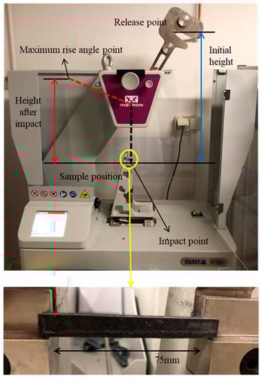 For sandwich composites, usually, only tests in the flatwise direction are carried out. The Charpy impact strength of the composites was tested according to EN ISO 179-1 []. This test was designed to measure the resistance to failure of a material subjected to a suddenly applied impact. The value measured was the impact energy or the energy absorbed before fracture. The apparatus consisted of a pendulum of known mass and length that was dropped from a known height in order to impact a notched specimen of material. The energy transferred to the material could be inferred by comparing the difference in height of the hammer before and after the fracture (energy absorbed by the fracture event, see Figure 4), which is denoted by W. The length (l) and width (b) of the specimens were 80 mm and 10 mm, respectively. The resilience (K) can be computed by the following: