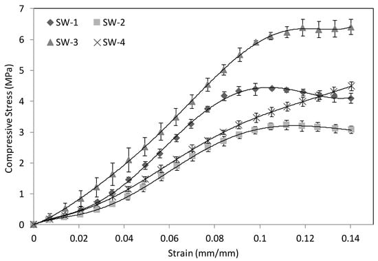 The effects of the foam core on the ultimate stress until failure and the compressive modulus can be obtained by comparing SW-1 and SW-2. The stress value and the slope of SW-1 are higher, which indicates that compressive strength and modulus increase with the presence of a foam core. The columns in the Z-direction and the core layers (foam or foam/non-woven) carry the compressive load together. Nevertheless, by using Equations (9)–(11) and (13), it can be seen that the increases in the stress value of non-woven materials are higher than those of pure foam.