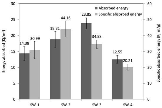 The results of the Charpy absorbed energy (Kj/m2) of each group are presented in Figure 7. SW-3 has the highest impact strength (23.85 Kj/m2) among these four groups of samples. PP foam has a low fracture toughness; it promoted the extension of cracks from the top skin to the bottom skin by connecting these two skins. This resulted in a rupture of both skins (as shown in Figure 8) and a lower absorbed impact energy. Compared with the hollow structure (SW-2), the presence of the foam core (SW-1) increased the brittleness of the core. The absorbed energy of SW-3 is approximately 66% higher than that of SW-1 (14.38 Kj/m2). Pure epoxy resin and carbon fiber are normally considered brittle materials []. However, toughness is related to both strength and brittleness. The tensile strength and elongation at the break of the resin-infused non-woven composite were measured as 63.79MPa and 1.49%, respectively. Compared with the parameters the of foam (1.02 MPa and 6.7%), it can be obtained that the non-woven composite layer has a higher toughness. This can contribute to improving the toughness of the whole sandwich structure. Moreover, the higher absorbed energy of the fiber/resin columns compared with the pure resin columns (SW-4) can be explained by the same mechanism.