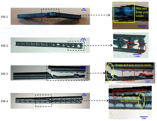 The photographs of the fractured samples of each set are presented in Figure 8. A brittle fracture tendency can be seen in the sandwich with core layers (SW-1, SW-3, and SW-4) by visual analysis, which shows more serious damage to the core structure. The delamination between the core and the skin can be observed in all of the sandwich groups except SW-1, and the cracks of the foam and non-woven layer are determined. The fracturing of the columns mainly occurred at the connection points between the columns and the composite layers (the fabric skin and the non-woven core ply), which is the weak zone of the columns’ mechanical property.