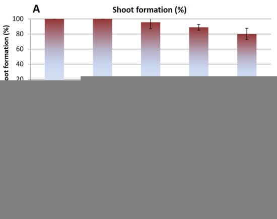 To evaluate the inclusion of MS nutrient medium in the encapsulation matrix on subsequent shoot regeneration, shoot tip and 1st-node segment explants (in equal number) were immersed in a sterile solution of 2.5% sodium alginate (control) (molecular weight 195.16 (theoretical) or 219 (actual average); AppliChem, Darmstadt, Germany)) and also in autoclaved MS liquid nutrient medium (without Ca) supplemented with 2.5% sodium alginate as the gelling agent. Then, explants from the two treatments were taken by forceps and dropped individually to two different beakers containing a sterile solution of 50 mM calcium chloride (CaCl2.2H2O) under gentle stirring for 30 min, in order to complete the ion-exchange (Na+/Ca2+) reaction. All operations were conducted in the sterile conditions of the laminar-flow hood, at a room temperature of 23 °C. After hardening, the produced beads were retrieved and rinsed twice with sterile distilled water to remove traces of calcium chloride. In order to test the recovery of shoots under in vitro conditions, the beads were transferred to glass tubes (100 × 25 mm) containing 10 mL of solid MS nutrient medium supplemented with 1 μM of IAA (Sigma-Aldrich, St. Louis, MI, USA) and 5 μM of BAP and incubated in a growth chamber under light or in darkness provided by covering the cultures with a black fabric sheet. The evaluation of the regeneration response was made after four weeks of culture by estimating the shoot formation frequency (%) and measuring the number and length of produced shoots.