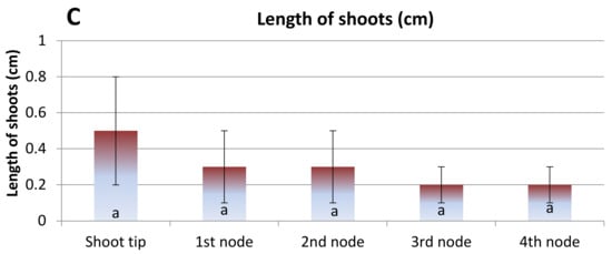Gardenia shoots developed from encapsulated shoot tip explants, after a 12-week cold storage, were induced to root in vitro (Figure 2D). With the addition of 0.5 μM of IAA to the solid MS nutrient medium, gardenia shoots formed roots in a 4-week rooting period at very high percentages (data not shown), which is in agreement with a previous work of Hatzilazarou et al. [] referring to gardenia microshoot rooting up to 100% in vitro. These findings showed that the rooting ability of gardenia shoots, which were generated from encapsulated explants after being stored at 4 °C for 12 weeks, was not affected by the cold storage, achieving high rooting percentages. Similar observations on the rooting of shoots derived from regrowing artificial seeds, after cold storage, were reported for Nerium oleander [] and Viburnum dentatum [].