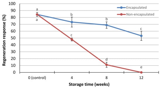 Effect of storage at 4 °C for different time periods (weeks) on subsequent regeneration responses (%) of encapsulated and non-encapsulated shoot tip explants of G. jasminoides, on MS nutrient medium with 1 μM IAA and 5 μM BAP, after 4 weeks of culture. Means ± SD (n = 45) followed by different letters are significantly different according to Duncan’s multiple range test at p ≤ 0.05.