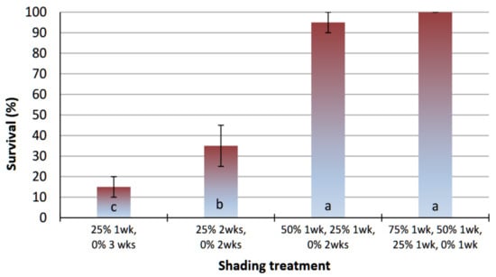 Effect of different shading treatments during acclimatization of in vitro-produced plantlets of G. jasminoides, derived from regenerant shoots of encapsulated shoot tip explants which had stored at 4 °C for 12 weeks, on their survival rate. Bars represent the means ± SD (n = 45). Bars with different letters are significantly different according to Duncan’s multiple range test at p ≤ 0.05.