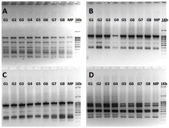 ISSR amplification profiles of eight plantlets (G1–G8), derived from cold-stored germinated artificial seeds, and mother plant (MP) of G. jasminoides obtained with primers UBC 841 (A), UBC 811 (B), UBC 810 (C) and UBC 816 (D). The size of the amplified bands was calculated using 1kb DNA ladder (100–3000 bp) and the image has been converted to black and white and to negative.