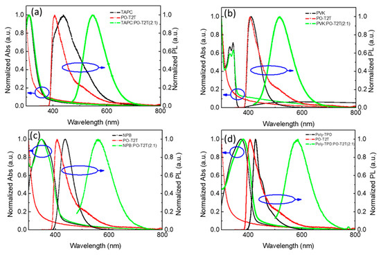 Absorption and photoluminescence (PL) spectra of donors, acceptor, and exciplexes obtained in solid films in air (for PL, λex = 330 nm): (a) TAPC:POT2T, (b) PVK:POT2T, (c) NPB:POT2T, and (d) Poly-TPD:POT2T.