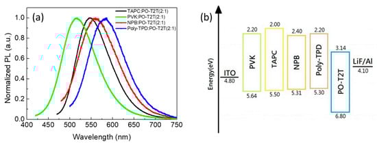 The chemical structure of the commercial materials studied in this work are shown in Figure 1. TAPC, PVK, NPB, and Poly-TPD were used as electron-donors and POT2T as electron acceptor, forming D:A combinations as exciplex hosts in this work. Figure 2 shows the photoluminescence (PL) characteristics of all materials, including donors, acceptor, and their blends. All donors and the acceptor showed blue emission, but red-shifted emission was observed in all the blends, indicating the presence of exciplexes in all D:A combinations. It is noted that no residue emissions from individual D and A components could be found in the blended films. This may be attributed to the fact that exciton emissions only from the CT states of exciplexes appeared, implying good exciplex formation with pure color through the combinations of commercial materials. Figure 3a shows the different wavelengths of emissions from the blended films. This is because the ionization potential (IPD) of the donor and the electron affinity (EAA) of the acceptor determine the energy of the CT state between exciplex molecules [26,27]. These are generally identified as the energy difference between the HOMO of the donor and the LUMO of the acceptor [28]. The difference in the emission wavelengths is attributed to the energy level IPD − EAA of all exciplex blended films. When the IPD − EAA energy level difference is larger, the exciplex emission tends to blue shift. The IPD of TAPC, PVK, NPB, and Poly-TPD was 5.50, 5.64, 5.31, and 5.30 eV, respectively. The EAA of POT2T was 3.14 eV (Figure 3b). The details of the IPD − EAA difference of all blended films are listed in Table 2.