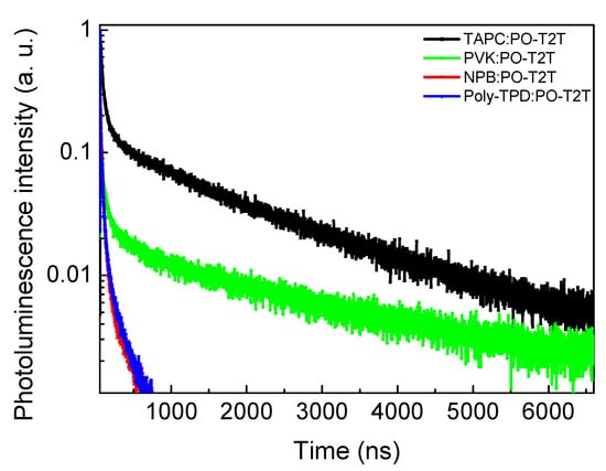 As discussed above, the exciplex formation between the four commercial donor molecules and POT2T was found by PL spectroscopy measurement. To further verify the best combination of donor and POT2T molecules to form exciplex states, transient photoluminescence (TRPL) was used to confirm the exciton decay time of the blended films. The TRPL curves shown in Figure 4 are fitted by a three-exponential decay and average exciton lifetime (τav), summarized in Table S1. The various donor molecules cause the obviously different variation tendency of the TRPL curves, implying different delayed fluorescence of exciplexes of the blended films. The τav of TAPC, PVK, NPB, and Poly-TPD/POT2T was 0.67, 0.61, 0.15, and 0.09 μs, respectively (see Table S1).