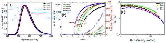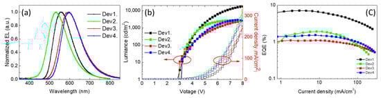 Figure 6 shows the lowest turn-on voltage (Von = 2.2 V) and highest current density in Dev8 due to the highest conductivity of the thinnest film. The slightly decreased EQE is seen in Dev5 with the largest thickness (Table 4), which may be caused by triplet–triplet annihilation (TTA) [30]. The highest EQE (7.1%) is obtained in Dev6, which is higher than the device prepared by the vacuum process in previous reports (Table 1) [24,25].