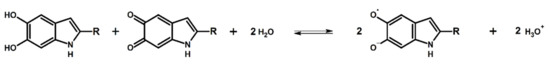 When it comes to the formation of melanin proper from DHI and DHICA, current knowledge is much less clear. However, some progress has been made, famously by Italian chemists. For example, Edge et al. demonstrated that dopaquinone can react with DHI to form the DHI quinone, a highly reactive system that goes on to form the black insoluble polymer [29]. This may not hold for DHICA per se, which may need enzyme intermediates [18]. DHI quinone and DHICA quinone can readily dimerize with either DHI, DHICA, or both, to yield homodimers and heterodimers. Furthermore, various oligomers up to the stage of tetramers have been isolated and characterized in the form of acetylated derivatives for DHI or non-derivative forms of DHICA [36]. These oligomers form supposedly through free radical polymerization, but the exact mechanism to date is still up for debate [22].