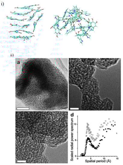 (i) A model stacked oligomeric structure proposed for melanin. Figure adapted with permission from C. Chen, F. J. Martin-Martinez, G. S. Jung and M. J. Buehler, Chem. Sci., 2017, 8, 1631 under Creative Commons Attribution—Published by The Royal Society of Chemistry [22]. (ii) Real space images from TEM showing the stacking of the oligomers in both synthetic biomimetic versions and natural sources of melanin are also depicted. (a) Depicted is a low-resolution bright field transmission electron micrograph of synthetic melanin (scale bar: 50 nm). (b) A high-resolution bright field transmission electron micrograph of synthetic melanin (scale bar: 5 nm). (c) A high-resolution bright field transmission electron micrograph of synthetic melanin (scale bar: 5 nm). (d) A scaled radial power spectrum of (b) shown as solid black squares and (c) shown as open black squares. The narrow peaks in the spectra are centered at 3.9 A˚ and 3.7 A˚, respectively, for the images (b,c). Adapted from [42] with permission from The Royal Society of Chemistry.