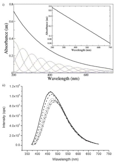 (i) An example of melanin’s UV-Vis absorbance spectrum. A log-linear plot of the data is depicted in the inset, demonstrating its exponential behavior. (ii) An example of the fluorescence emission spectra of melanin. The various dotted lines indicate the spectra obtained with variation of the laser pump energy (360 nm—solid line, to 380 nm—inner dot–dash line, in 5 nm intervals). Figures adapted from Ref. [69] with permission from The Royal Society of Chemistry.