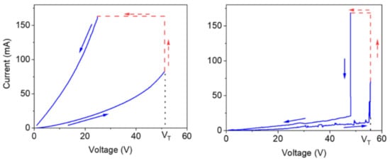 Electrical switching behavior observed in a pressed powder pellet of melanin as published by the Santanto group. On the left the behavior of an apparent dry sample is shown and on the right a wet sample is shown. As can be seen, as the voltage is increased up to a threshold voltage VT, the material enters a low resistance phase. Reprinted with permission from M. Raeli, A. Gouda, J. Bellemare et al., ACS Appl. Bio Mater., 2020, 3, 5244–5252 [105]. Copyright 2020 American Chemical Society.