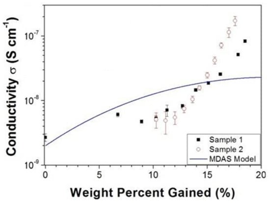 One thing that is interesting about all the observations above, is that melanin’s conductivity in the condensed matter state can be significantly changed depending on its water content (see Figure 10) [77,80,99,106,107,108]. Indeed, the switching behavior of melanin could not be induced in the dry state [107], though recent work suggests that it can (i.e., Figure 9, left) [105]. The need for hydration in obtaining switching behavior has originally led to a model where water is required to increase the dielectric constant of the material, which would narrow the band gap between the semiconductor valence and conduction mobility edges [102,106,107]. This model was tested (see Figure 10) and found to be incompatible with the experimental data [106].