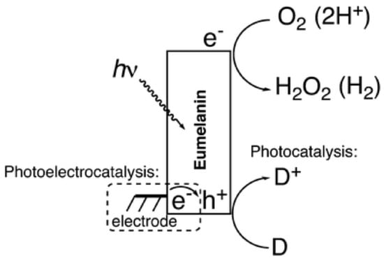 The proposed mechanism for DHI-melanin’s photocatalytic effect. Light is absorbed by melanin where electronic charges are generated. Reduction of oxygen to hydrogen peroxide proceeds in oxygenated conditions, or reduction of protons to hydrogen in deoxygenated conditions. Figure adapted with permission from L. Migliaccio, M. Gryszel, V. Ðerek et al., Mater. Hor., 2018, 5, 984 under Creative Commons Attribution—Published by The Royal Society of Chemistry [136].