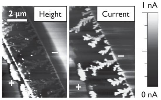 An interesting and accidental discovery was made by Wünsche et al. where they tested melanin thin films on gold electrodes under humid conditions [142]. They found that, under long periods of voltage bias, one is able to form gold dendrites (Figure 13), which form at the positive electrode and grow towards the negative electrode. They could achieve this effect as long as melanin had phenolic hydroxyl groups present. It is believed that this effect of the dissolution of the Au electrode is enabled by low amounts of Cl− present in melanin coupled with its reducing ability and metal ion binding capability. This result could potentially be exploited for the in situ formation of Au-melanin nanostructures and biocompatible resistive switching memory devices.