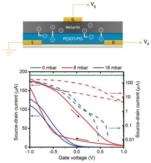 Explicitly utilizing the comproportionation reaction and hydration dependence, Sheliakina et al. were able to demonstrate the first ever all solid state organic electrochemical transistor based upon a biomaterial (i.e., melanin), see Figure 14 [143]. The interesting thing about these transistor devices was that, as they were wetted, their performance improved. This is mainly due to increasing water content leading to an increase in protons via the comproportionation reaction (Figure 2). The device works by injecting protons from the melanin top layer into the conductive polymer channel, where the protons de-dope the channel. Given that melanin is mechanically flexible and biocompatible, this work demonstrates that bioelectronic sensing devices based on melanin for potential in vivo applications can be a reality, as opposed to many other conductive materials whose performance degrades with hydration.