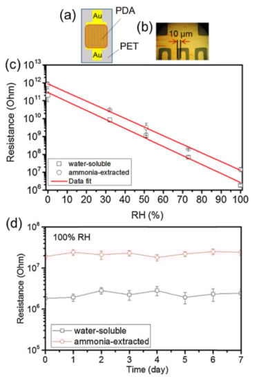 - Wu, T.-F.; Hong, J.-D. Synthesis of water-soluble dopamine–melanin for ultrasensitive and ultrafast humidity sensor. Sens. Actuators B Chem. 2016, 224, 178–184. [Google Scholar] [CrossRef]