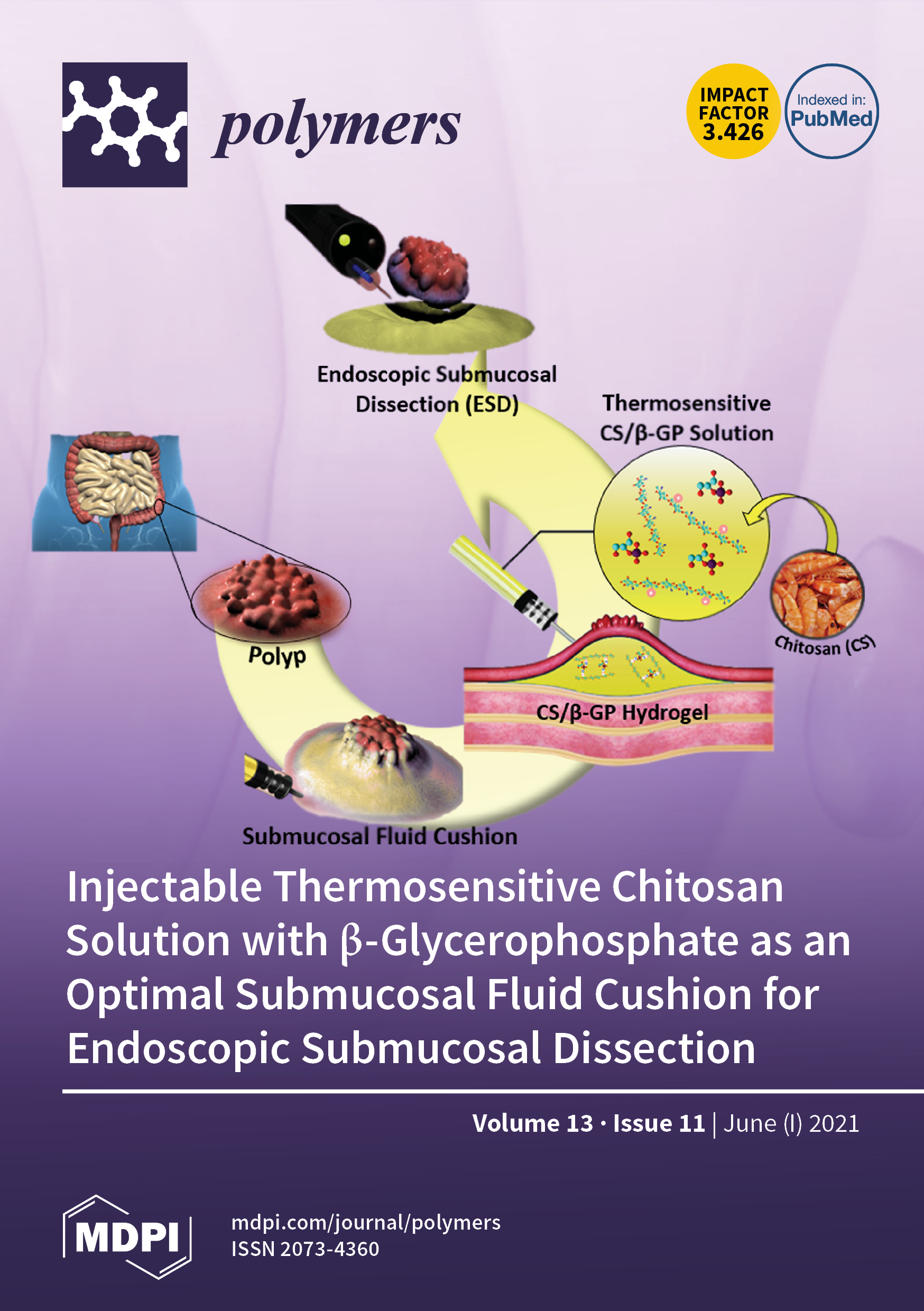 Cover Story: Endoscopic submucosal dissection (ESD) is a surgical procedure to remove lesions in the gastrointestinal tract. A submucosal fluid cushion (SFC), such as normal saline, is used to prevent perforation; however, its cushioning maintenance is insufficient for surgery. In this study, we introduce an injectable thermosensitive chitosan solution (CS) with β-glycerophosphate (β-GP) as an SFC for ESD. The CS/β-GP solution showed viscosity change at 36.5 ℃ with acceptable injectability and biocompatibility similar to commercial products. A preclinical study presented high cushioning maintenance of the solution. These results indicate that the CS/β-GP solution might be used as an SFC in ESD. View this paper.