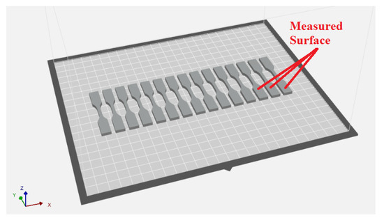 Test samples were designed according to Figure 2 using SolidWorks (Dassault Systems SolidWorks Corp., Waltham, Massachusetts) and then approximated with triangles to create STL files. In order to accurately reproduce the 3D model of the samples, the saving of STL files took into account two tolerance parameters: linear tolerance—0.01 mm and angle tolerance—1°. The 3D sample model saved as an stl file has been approximated by 652 triangles and is shown in Figure 3. The sample models on the building platform with the marking of the metrologically measured surface is shown in Figure 4.