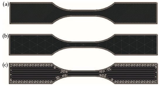 For experimental testing, three sets of samples in CFF technology were prepared, each with ten pieces. The first set, marked “O” (Figure 5a), had the main print set at infill 100%, thus full solid. Samples were made only from Onyx with a setting of two wall layers, 0.100 mm layer height and an Onyx material consumption of 1.56 cm3. The second set, labeled “ON” (Figure 5b), had a major infill printing parameter of 37% of pure Onyx with a setting of pattern triangular, two wall layers, 0.100 mm layer height and material consumption of 1.09 cm3. The last set of samples was reinforced with carbon fiber, marked “C”. The fiber placement is shown in Figure 5c, with the fiber fill type Isotropic chosen due to the distribution of the fiber throughout the sample. The fiber was laid in layers 5–8 and then 19–22, so there are a total of 8 layers of carbon fiber reinforced in the sample. In the remaining layers, the infill of the plastic material was set to 37% and, as in the previous samples of two wall layers, due to the reinforcing fiber, the layer height was set to 0.125 mm. This setting respects the recommended setting by Eiger. The consumption of Onyx material was 1.56 cm3, and carbon continuous fiber 0.26 cm3. The selected technological properties are presented in Table 2.