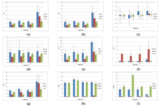 Surface parameters: (a) Pa/Wa/Ra, (b) Pq/Wq/Rq, (c) Psk/Wsk/Rsk, (d) Pku/Wku/Rku, (e) Pt/Wt/Rt, (f) PSm/WSm/RSm, (g) Pc/Wc/Rc, (h) Pdq/Wdq/Rdq and (i) PPc/WPc/RPc.