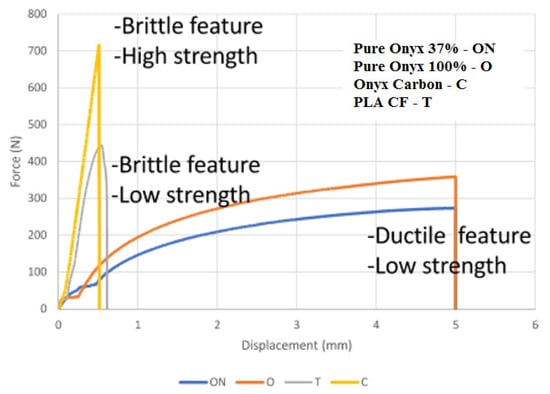 The quantitative analysis of the test results shows that the use of material—C (ONYX + carbon fiber) allows for the production of models with the highest strength, even over 100% greater than material—T (Carbonfil—PLA + carbon fibers), and it is almost 3 times more durable than pure ONYX with 100% and 37% filling. Moreover, it can be seen that both carbon fiber reinforced materials have a low elongation of less than 1 mm compared to PA-based Onyx 100% and Onyx 37%, where elongation was 5 mm. In the case of Young’s module analysis, it can be said that carbon fiber reinforced materials are characterized by a very high value of over 1200 for T material utilizing FDM technology and over 1400 for C material utilizing CFF technology. The much higher mechanical properties of material C (CFF) result from the characteristic way of building the interior of the models. In this technology, there is a high concentration of fibers pressed together and wrapped together like a rope, which guarantees high tensile strength. It seems that it would be reasonable to carry out compression and tensile tests taking into account stress relaxation tests during continuous loads in time.