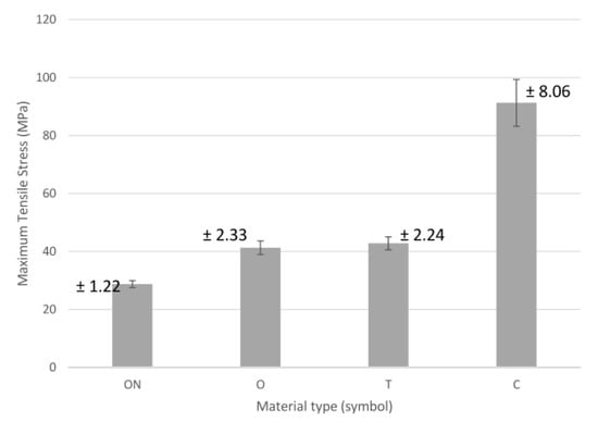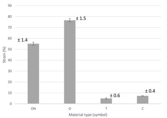 The variation of tensile strain is shown in Figure 10. Samples with labels T and C exhibit low tensile strain, which means the samples were brittle. However, samples reinforced with carbon fibers (C) showed characteristics of high stiffness compared with the samples reinforced with carbon fibers (T). Besides this, the sample reinforced with carbon fibers (C) has a slightly higher strain than the sample with carbon fiber T, though with better tensile strength. Sample T has the lowest strain and low strength. The strain value for the sample marked ON recorded a tensile strain value of 55%, whilst the sample marked O had the highest strain of about 76%. In general, samples ON and O showed ductile properties, low strength and low stiffness.