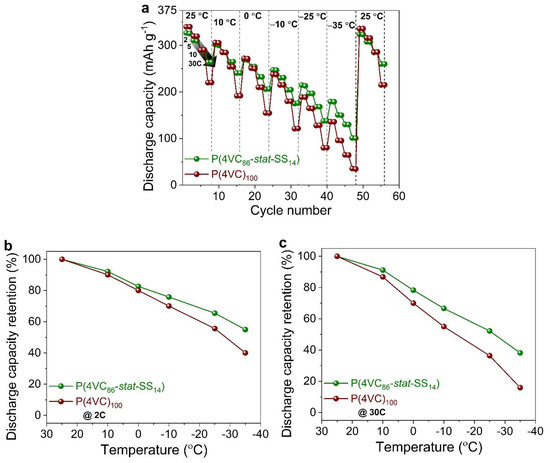 Comparative rate performance of Zn||P(4VC)100 and Zn||P(4VC86-stat-SS14) cells at different temperature and at different C-rates. (a) Discharge capacity vs. cycle number, recorded at different C-rates (from 2 C to 30 C) and at different temperature (from +25 °C to −35 °C). (b,c) Discharge capacity retention at 2 C (b) and at 30 C (c). The discharge capacities at lower temperature are normalized with respect to the discharge capacity at 25 °C.