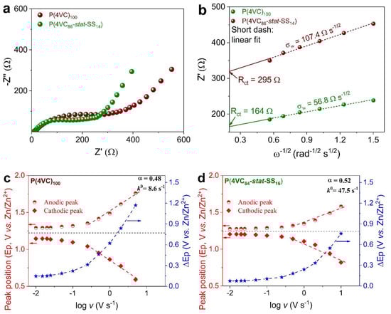 Charge-transfer resistance (Rct) obtained as the extrapolation of Z’ versus ω−1/2 linear regression plot (Figure 4b) according to the Equation (1) was found to be lower for P(4VC86-stat-SS14) (164 Ω) than the P(4VC)100 (295 Ω).