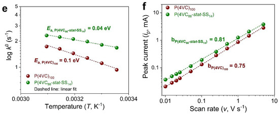 The CV analysis of both polymers over a wide range of scan rates from 0.01 to 100 V s−1 was carried out to determine other kinetic parameters of redox reactions (see Figure S4 for CVs). The P(4VC86-stat-SS14) was characterized by a smaller peak-to-peak voltage separation for all the given scan rates than the P(4VC)100, indicating faster kinetics for the copolymer. Quantitatively, apparent reaction rate constant (k0), determined from the scan rate-dependence of peak potential using the Laviron method [53] was found to be about 5.5-fold higher for P(4VC86-stat-SS14) (47.5 s−1) than the P(4VC)100 (8.6 s−1) (Figure 4c,d). Furthermore, Laviron approach was extended to study the dependence of formal potentials and thus k0 on the temperature (from 25 to 50 °C). An energy barrier activation energy (Ea) parameter, calculated using the negative slope of Arrhenius plots (Figure 4e, Equation (3)) was lower for P(4VC86-stat-SS14) (0.04 eV) than the P(4VC)100 (0.1 eV) [54].