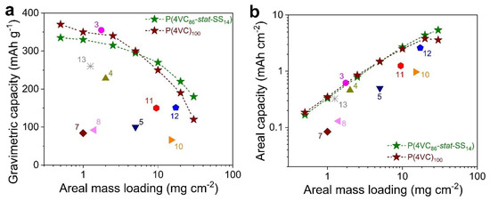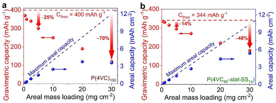 Comparative electrochemical performance of Zn||P(4VC)100 and Zn||P(4VC86-stat-SS14) cells at different mass loadings. (a,b) Gravimetric/areal capacities of P(4VC)100 (a) and P(4VC86-stat-SS14) (b) as a function of mass loading.