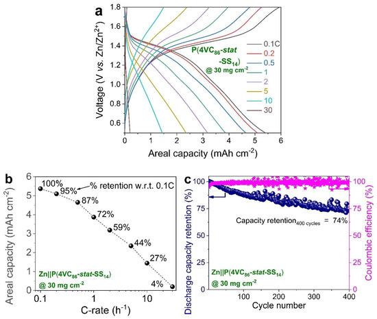 Moreover, when the capacities were normalized by per unit area of the electrode, areal capacity (mAh cm−2) for Zn||P(4VC86-stat-SS14) scaled almost linearly with the mass loading below 10 mg cm−2 due to its superior mass utilization, while significant deviation was observed in the case of P(4VC)100, particularly at higher mass loadings (Figure 5a,b). Promisingly, Zn||P(4VC86-stat-SS14) was able to attain the highest areal capacity of 5.4 versus 3.6 mAh cm−2 for Zn||P(4VC)100 at 30 mg cm−2. despite the high mass loading (i.e., 30 mg cm−2), Zn||P(4VC86-stat-SS14) was able to deliver satisfactory rate performance, attaining a high areal capacity of 1.5 mAh cm−2 at a C-rate as high as 10 C (~3.5 A g−1 or ~102 mA cm−2) (Figure 6a), that corresponds to 27% capacity retention compared to the capacity at 0.1 C (Figure 6b). This full-cell was also cycled reasonably, retaining 74% of its initial capacity over 400 cycles at 1 C (Figure 6c and Supplementary Figure S7). It is also worth mentioning here that, after the initial few activation cycles, the average Coulombic in the cycling tests remained above 99%.