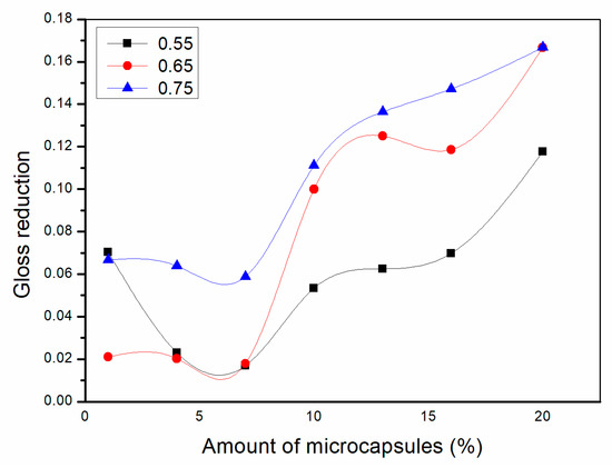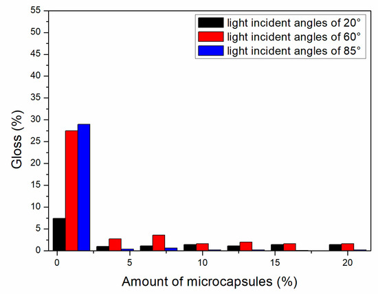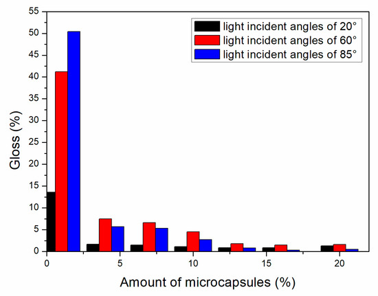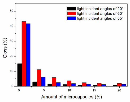 Effect of microcapsule content with the ratio of core materials to shell material in mass of 0.75 on gloss of coating film.