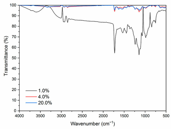 According to the results of optical and mechanical performances analysis, the paint film with 7.0% microcapsules has good optical and mechanical performances. The distribution of microcapsules with the ratio of core materials to shell material in mass of 0.65 in coating film was analyzed by SEM to determine the distribution of microcapsules in coatings. From Figure 7, with the increasing amount of microcapsules, the articulate sensation in the coatings on the Basswood surface becomes more obvious, which is not conducive to the uniform dispersion of coatings. The agglomeration of microcapsules in the coating becomes obvious, and the coating surface becomes more rough. Therefore, the higher the amount of microcapsules added, the more particles in the SEM, the greater the impact on the waterborne coating on the wood surface, and the more unfavorable it is for the paint film to play its own decoration and modification role. Three coatings with different microcapsule contents were tested by infrared spectroscopy, as shown in Figure 8. Compared with the waterborne coating with 1.0% microcapsule addition, the peaks of infrared spectral characteristic absorption peaks of the waterborne coating with 4.0% and 20.0% microcapsule addition decreased but did not disappear.