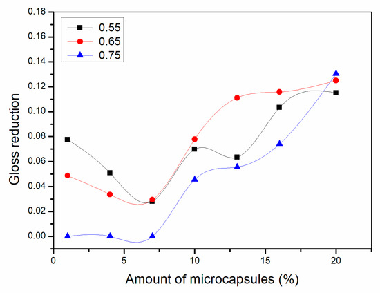According to Table 2, the impact strength of coating on Basswood surface was also affected by microcapsules. When the ratio of the core materials to the shell material in mass was 0.55, the impact strength of the waterborne coating with the addition of 13.0% microcapsule was the most significant. When the ratio of the core materials to the shell material in mass was 0.65, the impact strength of the waterborne coating with the addition of 7.0% microcapsule was the best. When the ratio of the core materials to the shell material in mass was 0.75, the impact strength of the waterborne coating with the addition of 7.0–16.0% microcapsule was the best. The microcapsule content enhanced the shock resistance of the paint film. The increase in microcapsule content is conducive to the stress transfer between the particles and the matrix, so that the load capacity becomes stronger.