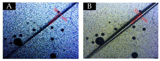 From the above analysis, at the content of 7.0%, the microcapsules with the ratio of core materials to shell material in mass of 0.65 can give the coating less chromatic aberration, excellent gloss, uniform surface color, better mechanical properties, and good aging resistance. Therefore, in the self-healing experiment, the effect of 0.65 the ratio of core materials to shell material in mass of microcapsules on the repairing performance of coatings at a content of 7.0% was studied. Scratches were made on the surface of waterborne coatings with microcapsules and without microcapsules. As shown in Figure 15A and Figure 16A, scratches were observed under an optical microscope. After standing at room temperature for 48 h, the scratches were observed again under the microscope. From Figure 15B and Figure 16B, the scratch on the coating without microcapsules has no self-healing effect, while the scratch on the coating with microcapsules has the self-healing phenomenon, and the scratch width has been reduced. Therefore, it is significant that the fluororesin as a healing agent is released from the cracked microcapsule to repair the scratches at room temperature when scratches appear on the surface of coatings. It has been proved that fluororesin microcapsules are effective in the self-healing process of scratches on the surface of waterborne coating.