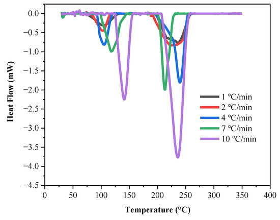 To strengthen the validity of the experimental data measured from ARC, we used the DSC instrument (HP DSC3, Mettler-Toledo Co., Zurich, Switzerland) to examine the standard electrolyte and PFPN-added flame-retardant electrolyte. The obtained specific exothermic characteristics of the new polymer composite flame-retardant electrolyte were further combined with thermokinetic models. The two electrolyte solutions were put into the aluminum DSC sample pan and sealed in a glove box filled with argon gas to prevent external moisture and oxygen from contacting the electrolyte. The net electrolyte content in the sample pan was 6.5 ± 0.5 mg. The samples were heated from 30 to 350 °C at heating rates of 1, 2, 4, 7, and 10 °C/min [22,23,24,25,26]. By comparing the thermal stability parameters (initial reaction temperature (To), peak temperature (Tp), and end reaction temperature (Te), the thermal behavior of the standard electrolyte and flame-retardant electrolyte were evaluated [27,28,29,30].